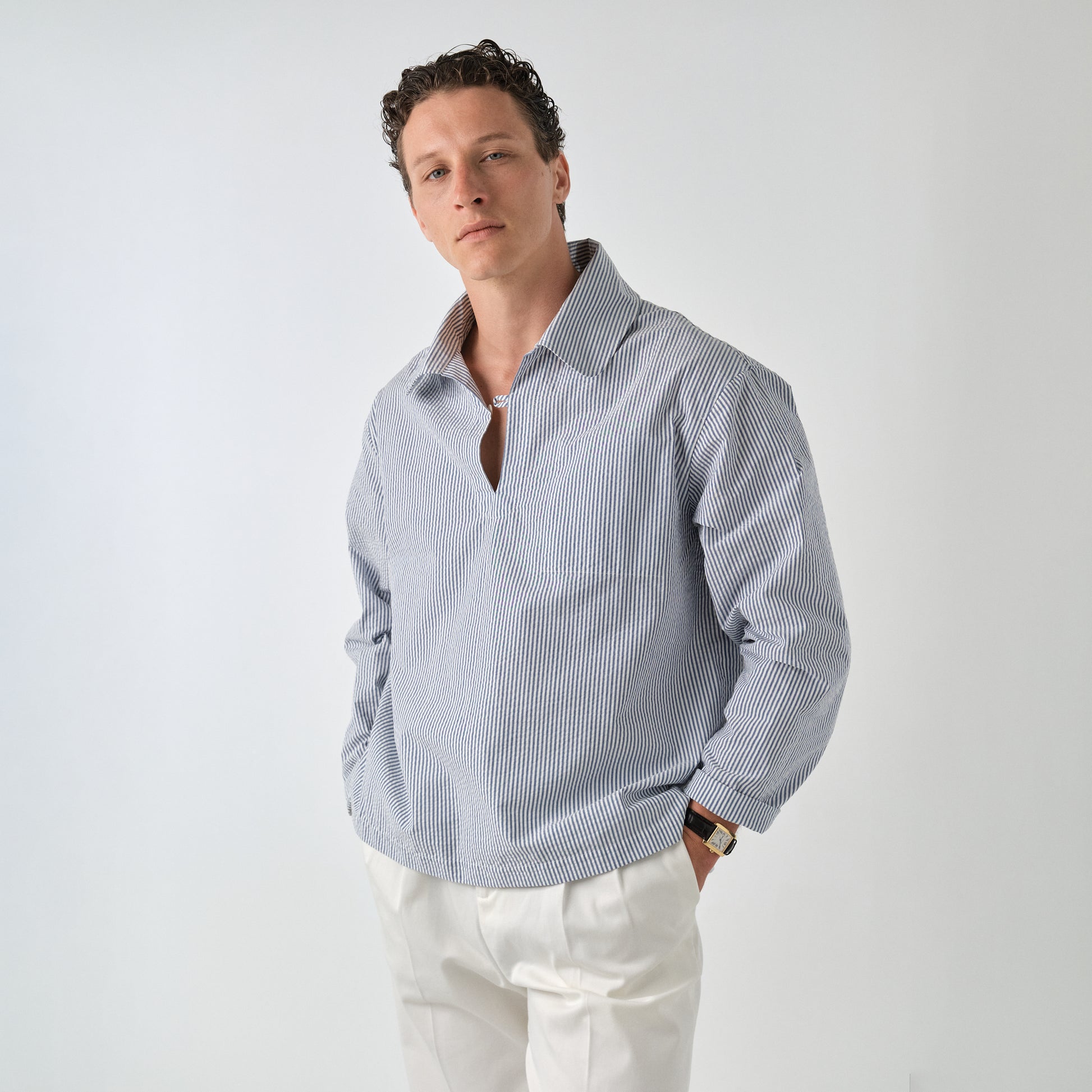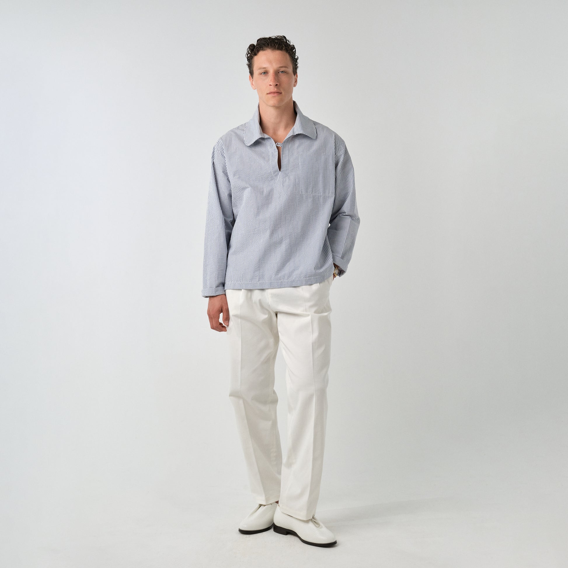 Son col généreux - aux airs de revers de costume – rappelle subtilement les encolures des tuniques vêtements méditerranéennes.